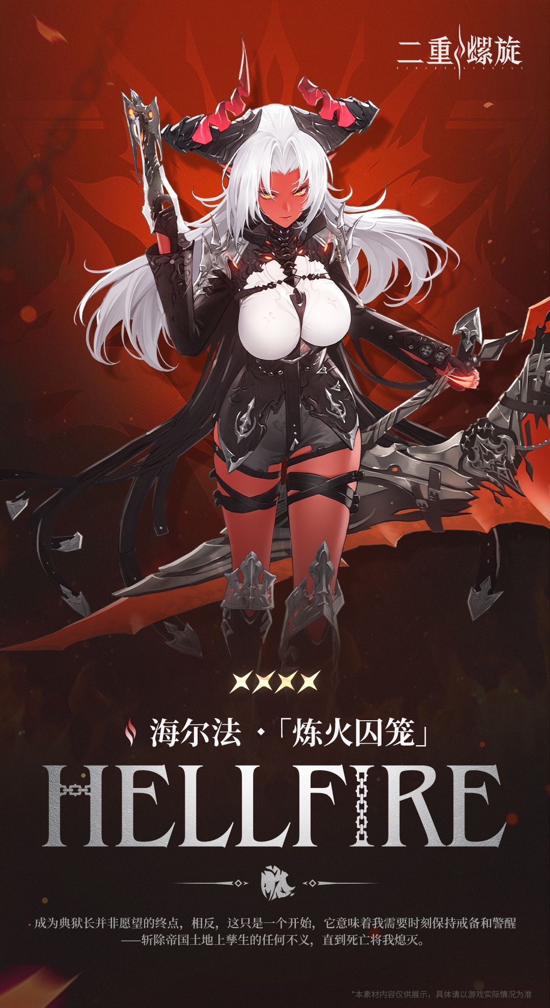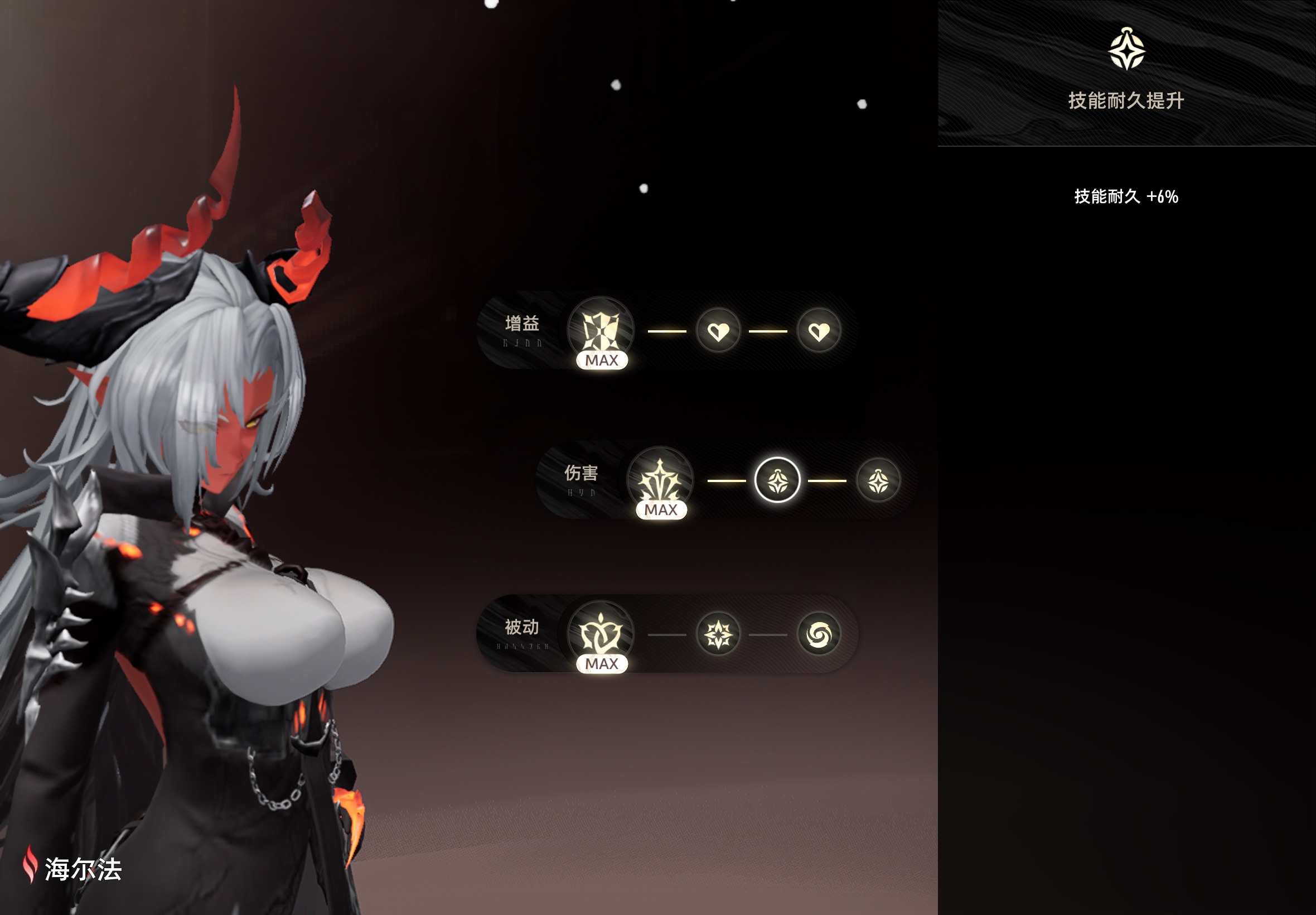 说实话海尔法的剧情和人设目前看起来是十分单薄的,但是我是真的第一次遇到这么符合心意的外观,我为红皮恶魔大姐姐扛大旗!因为我也不是非常能肝的人,所以过完主线后就想着别的角色用紫的就行,先给海尔法刷加10。当时看了jjj上的太刀海尔法攻略,所以还把周本次数拿去刷蒙恩了。但是规划被pvp活动打乱了,当时全紫赛琪只能打到a是真给我吓死了,紧急刷了精5裂魂和几个赛琪魔之楔,勉强达到s。目前海尔法魔之楔止步于加八加九,蒙恩精4,看来xp 还是要先给强度让路了,准备下版本冲65以后再接着给海尔法补满吧。