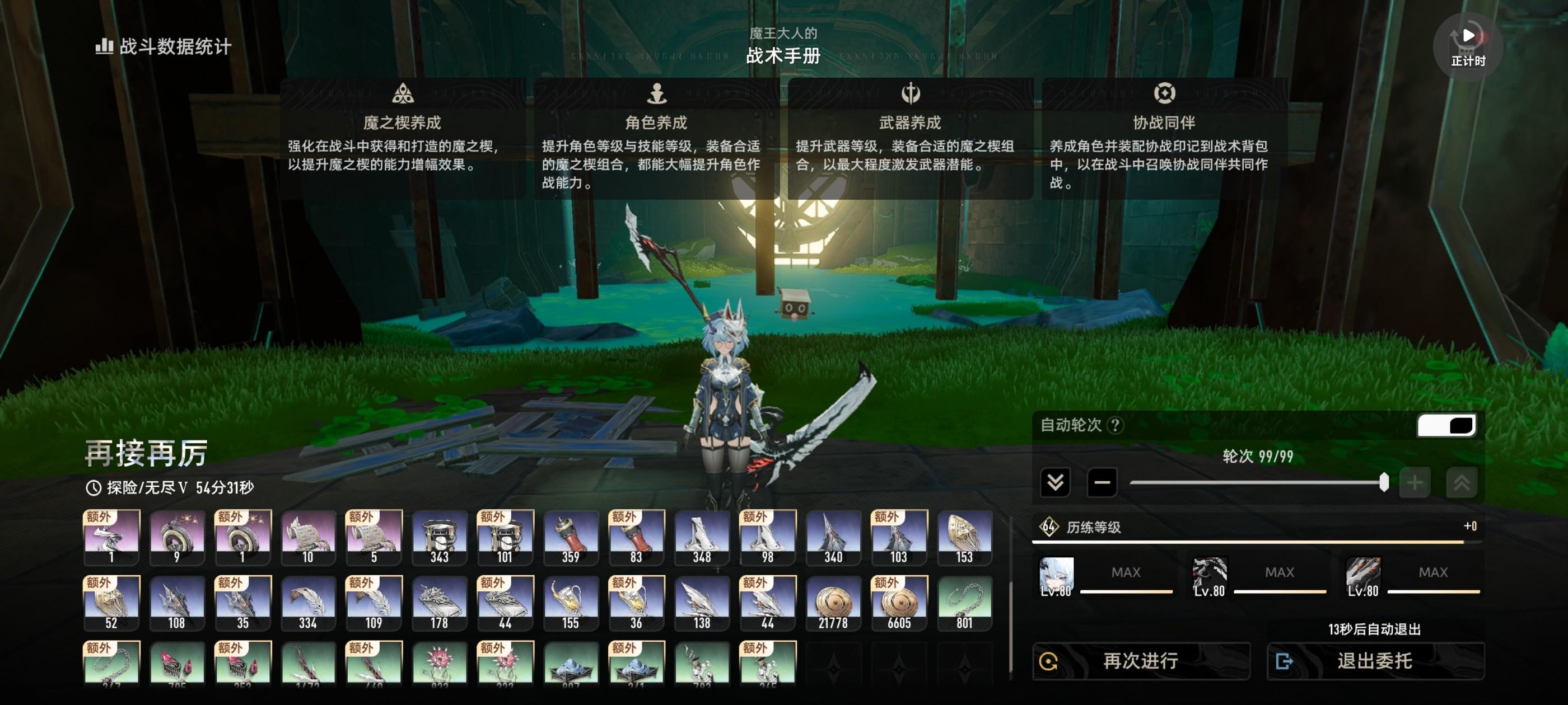 第一次刷到99层,用计时器看总共用了61分钟,我止流技能八级,三溯,魔之楔羽翼和中枢都是+9,扶疏全紫,我算了一下材料全卖了有48万铜币,到了后面止流总是挂机不动有人知道怎么回事吗