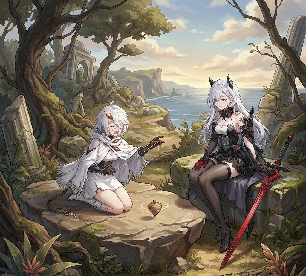 平时那双总是警惕地盯着风吹草动、仿佛随时准备拔剑的朱红眼眸,此刻正随着陀螺的轨迹笨拙地转动。她蹲在那里的背影不再像一张紧绷的弓,肩膀松垮了下来,银色的长发垂落在地,甚至连头上的角看起来都没有那么锋利了。