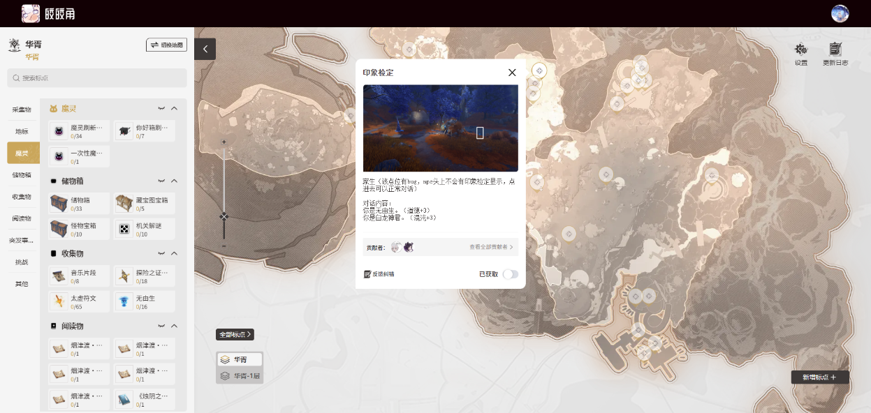 估计有不少玩家像我一样,在1.1查B站攻略交互了29个检测点。偶然翻皎皎角的地图工具,发现印象检测点是30个。