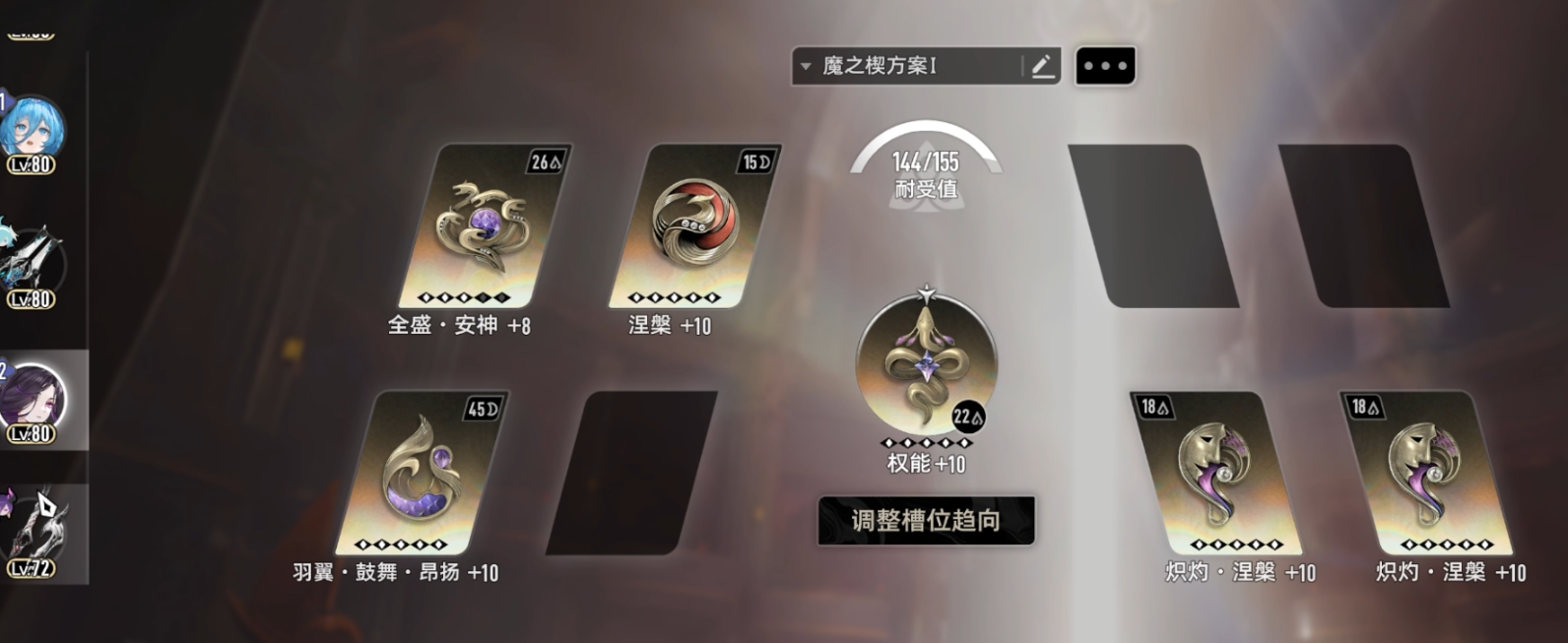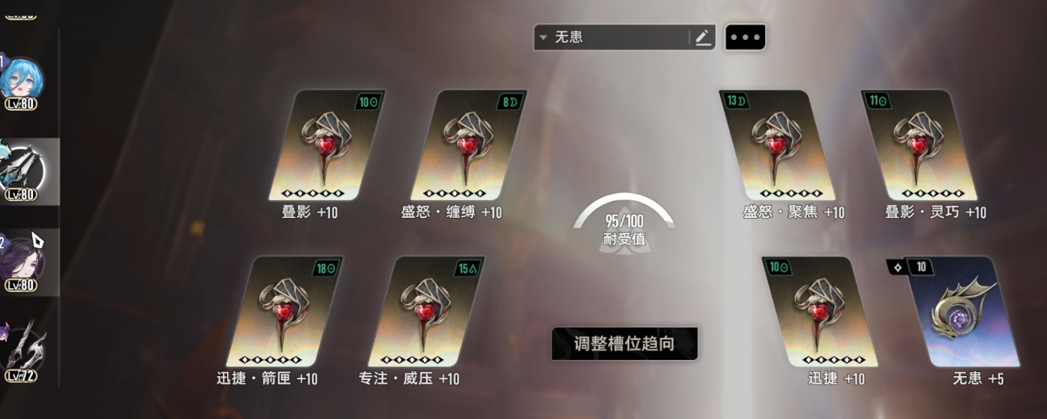菲娜就是普通输出配卡,这里因为配置原因没有上昂扬,理论上昂扬比振奋更好,但是为了稳定性我给西比尔上了安神回赛琪的蓝