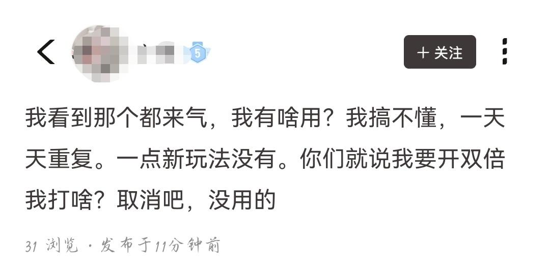 我看到那个都来气,我有啥用?我搞不懂,一天天重复。一点新玩法没有。你们就说我要开双倍我打啥?取消吧,没用的