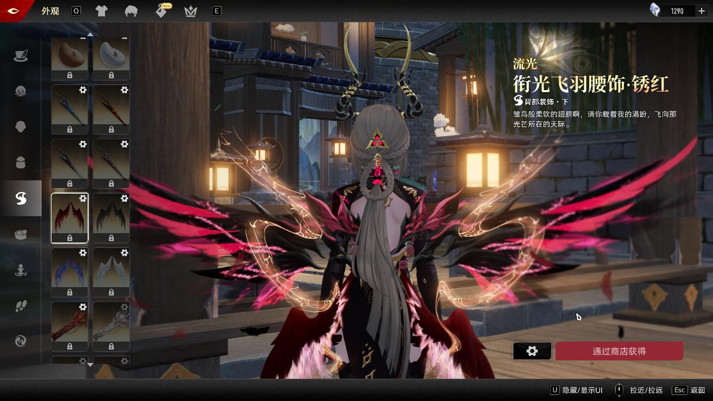 商店→外观→躯体装饰,在售的只有原色,换色是限时的。衔光飞羽是往期的,可以参考本期的鎏金飞羽,也是原色常驻换色限时。