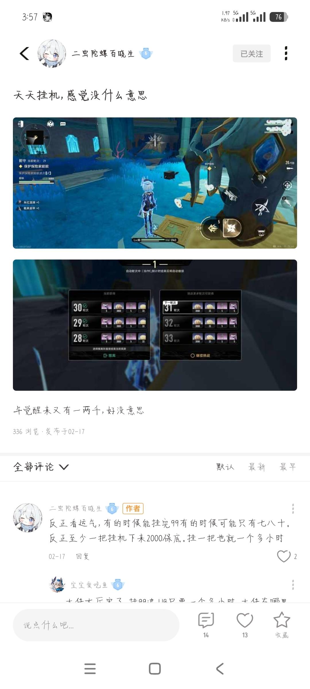 2月17号。说的是有时候才能挂99,有时候只能七八十,保底是2000只需要一个多小时,现在居然变成随便挂99只需要两个小时。你所说的除了没给具体配套,我都是用满配去测过的,就例如馨神的。黎瑟站着不动,6,000万打底,这个我也试了一下,得叠雷云才能上得去,不叠雷云的话,基本上是在2,000万。昨天晚上挂了下水道50级的本,我看了一下是2,400万,我都问你拿配置不动能打6,000万的,结果一馨神到现在都没回我