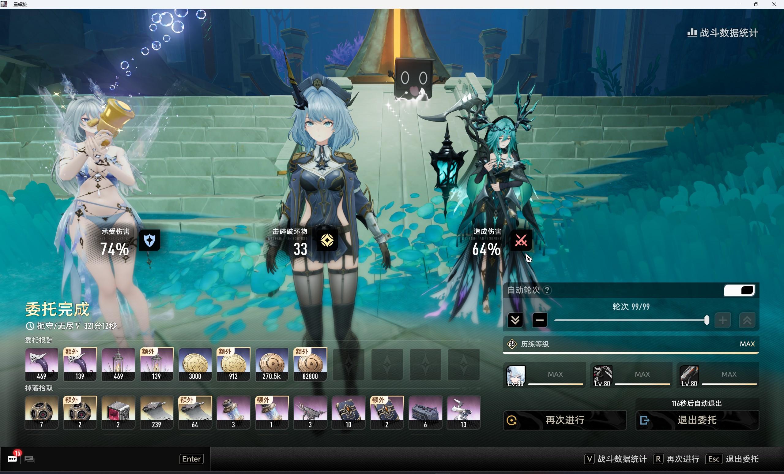 黎瑟:枯朽,赘生,夫人:花弓,扶疏:专武,武器都是满精炼mod如图,夫人的背水要换成炽灭或者决断