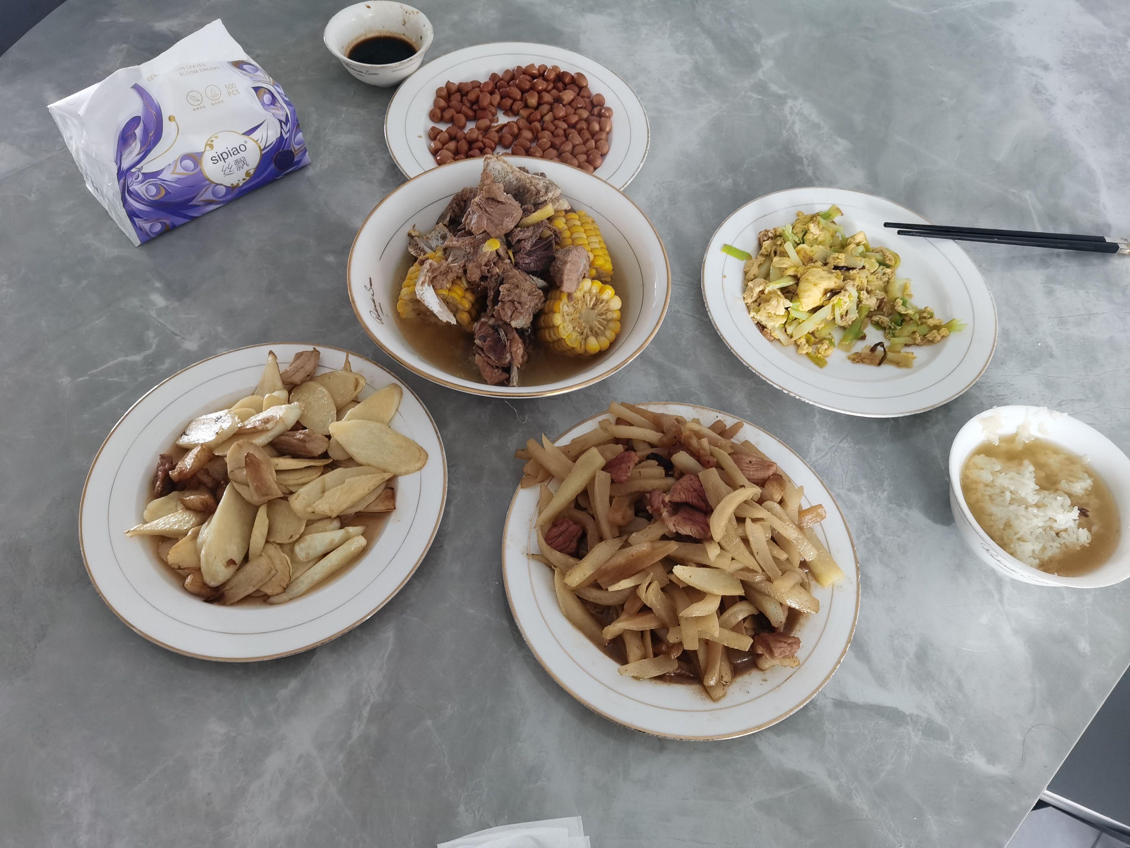 你看看 这是石菇炒肉 土豆炒肉 白菜炒鸡蛋 排骨玉米汤 花生米