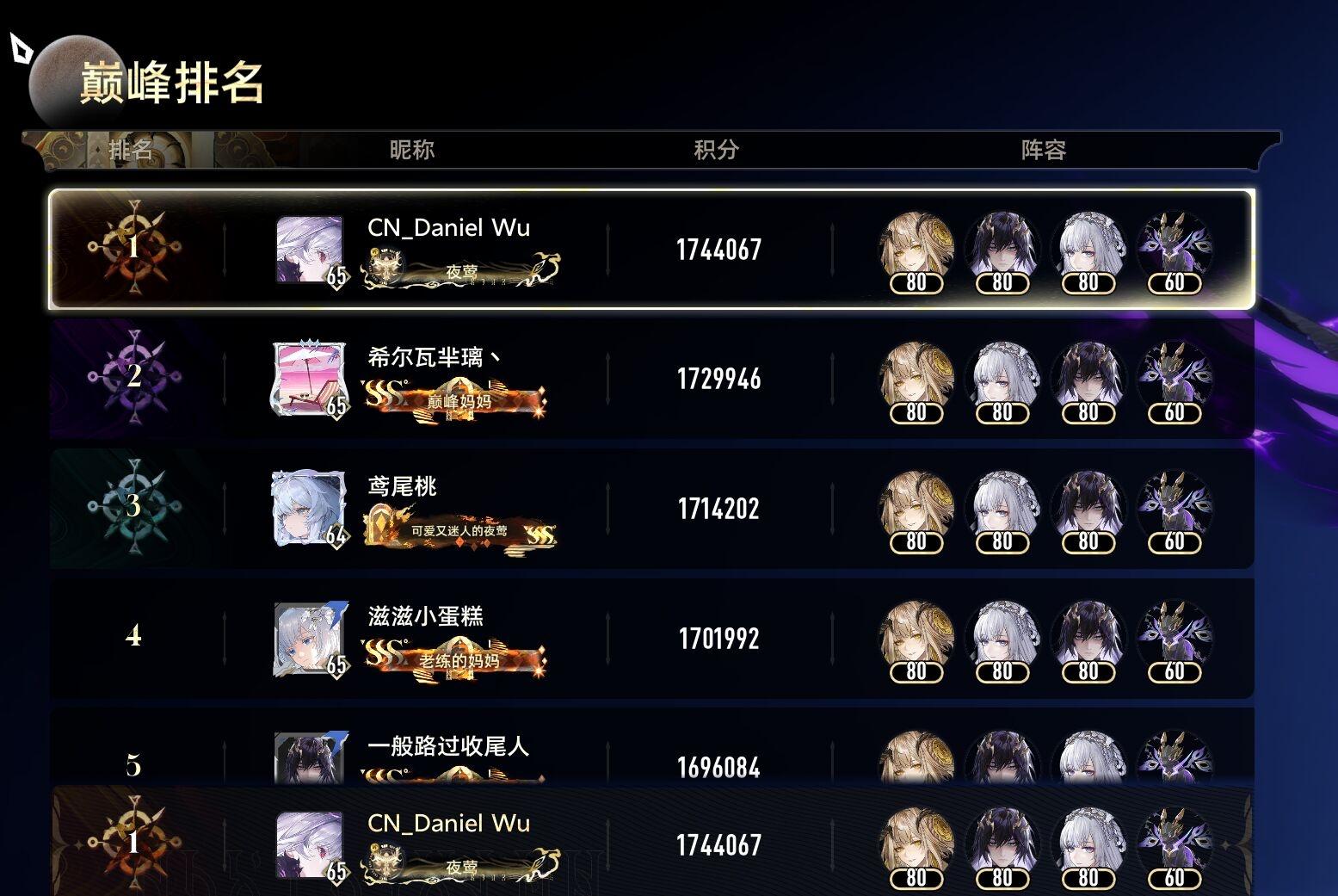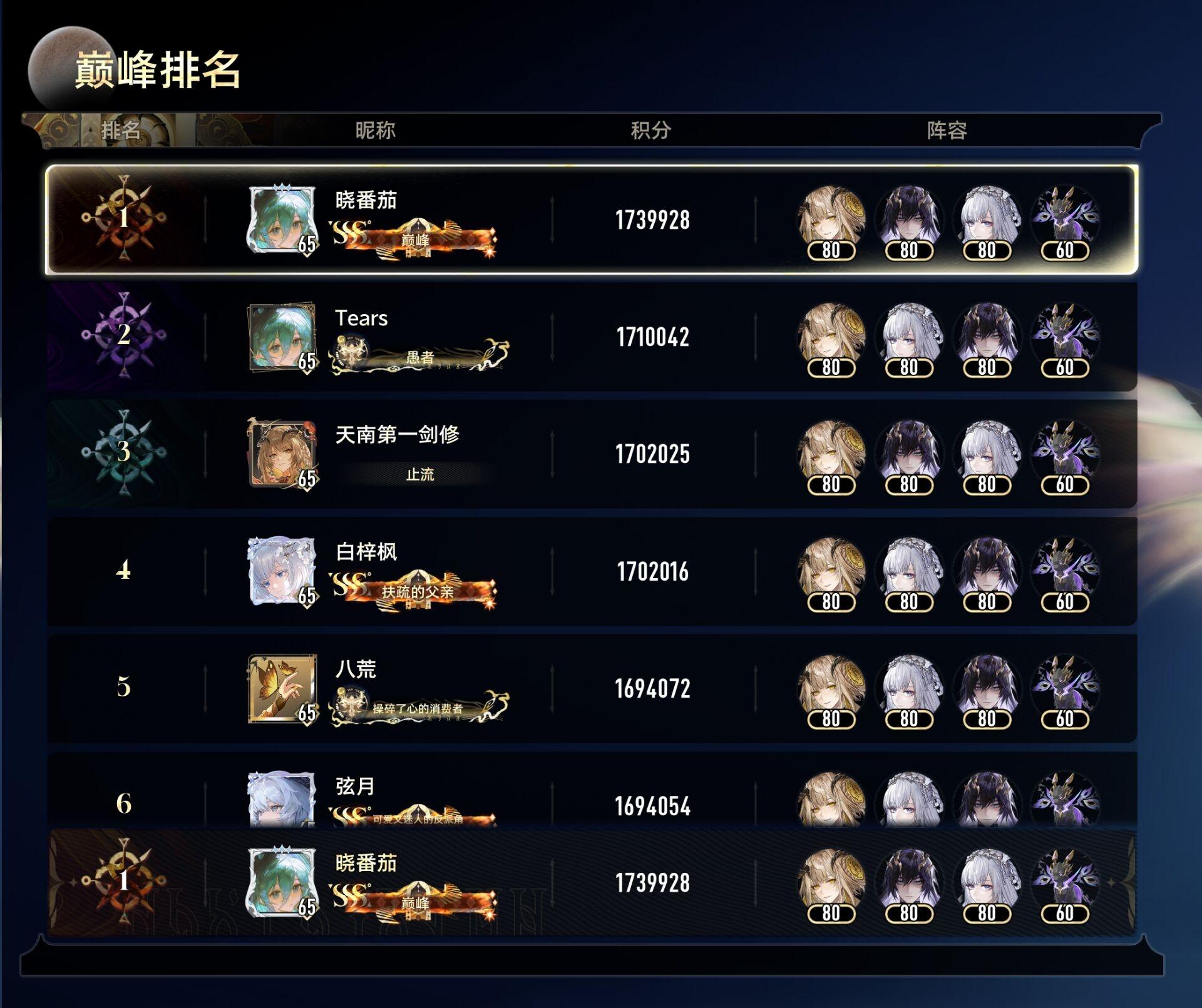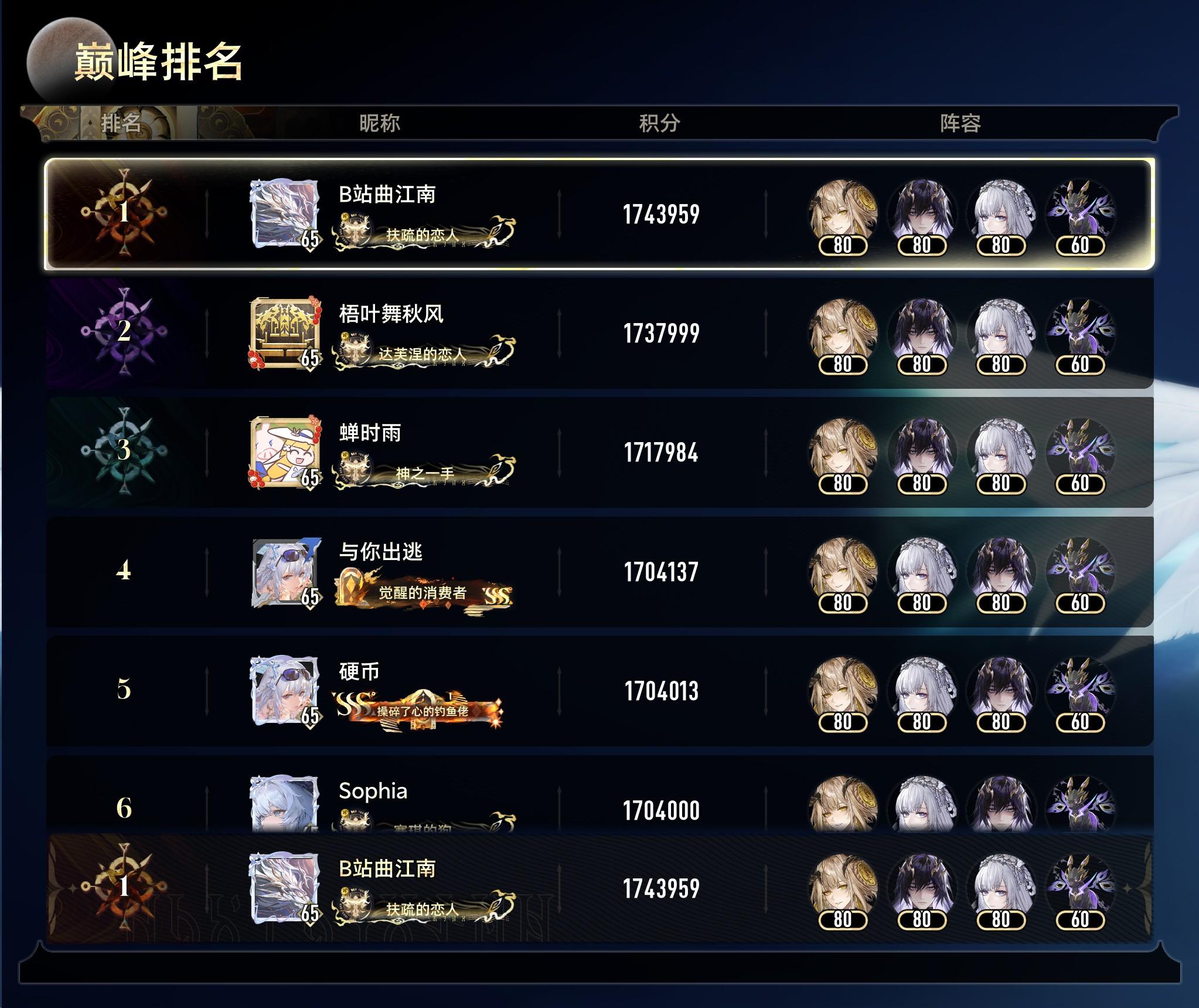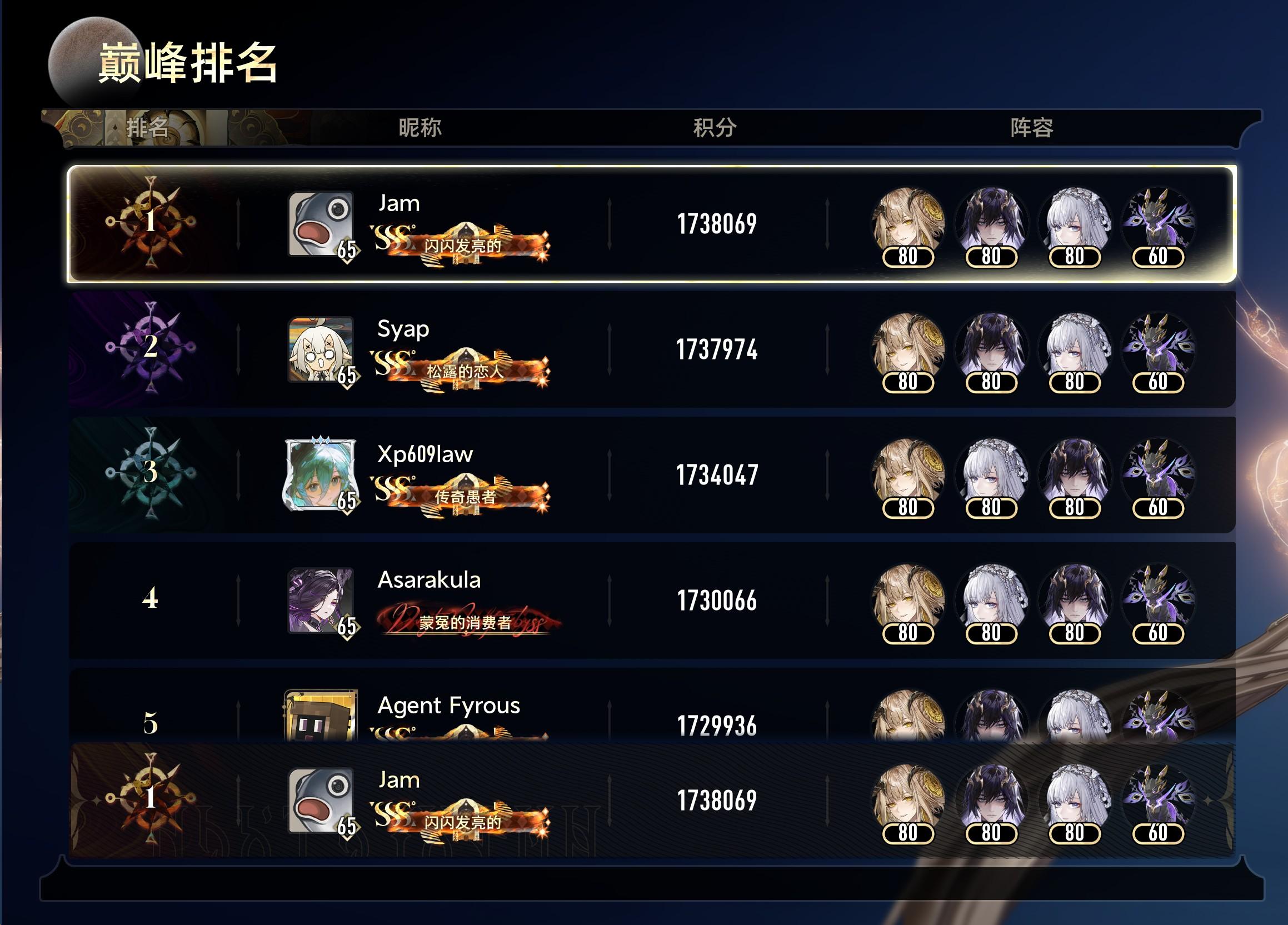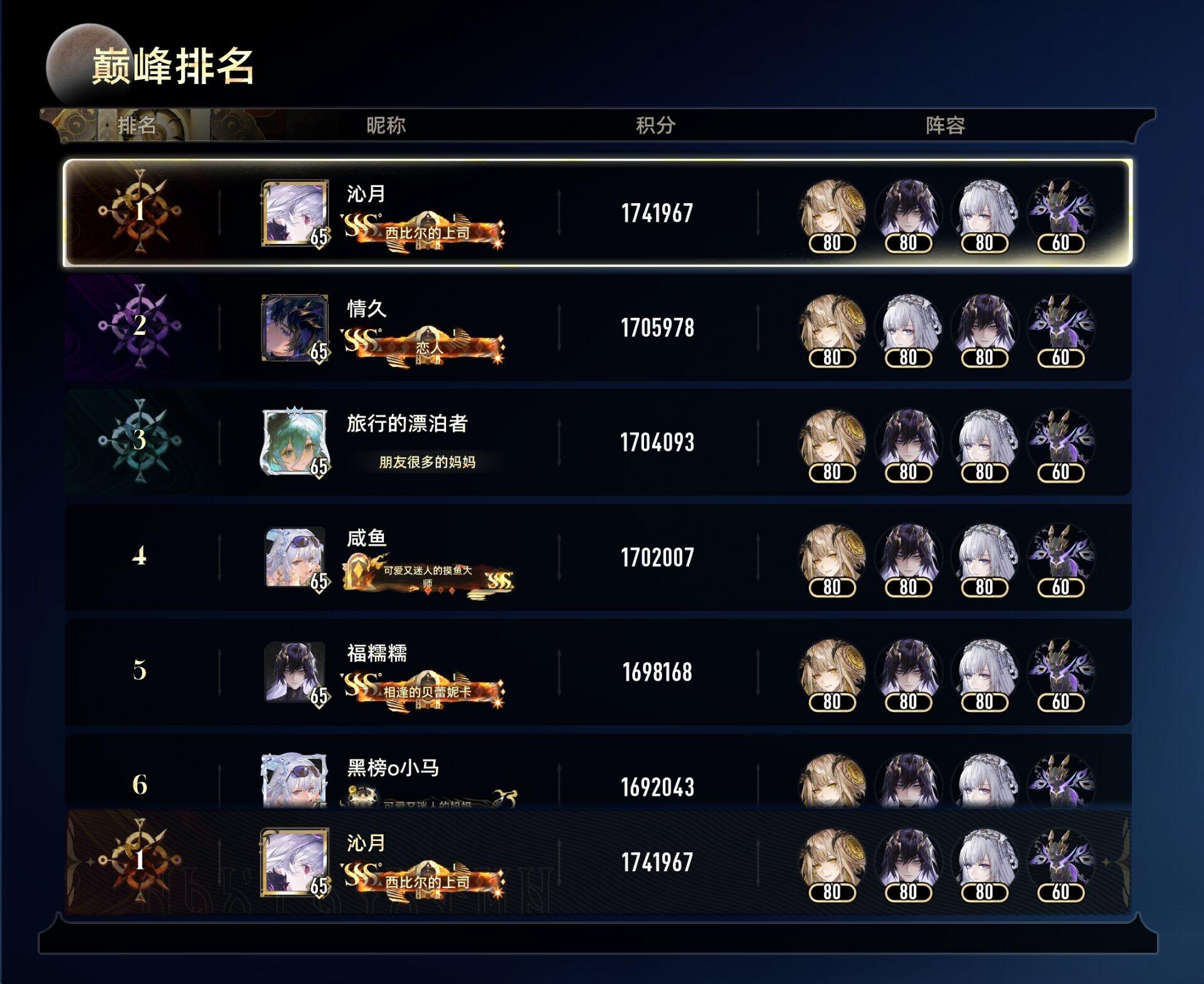 6个国服榜首+1个美服榜首,还有一个国服的打完忘记截图了,其中有好几个都是2/4溯的煜明未满配
