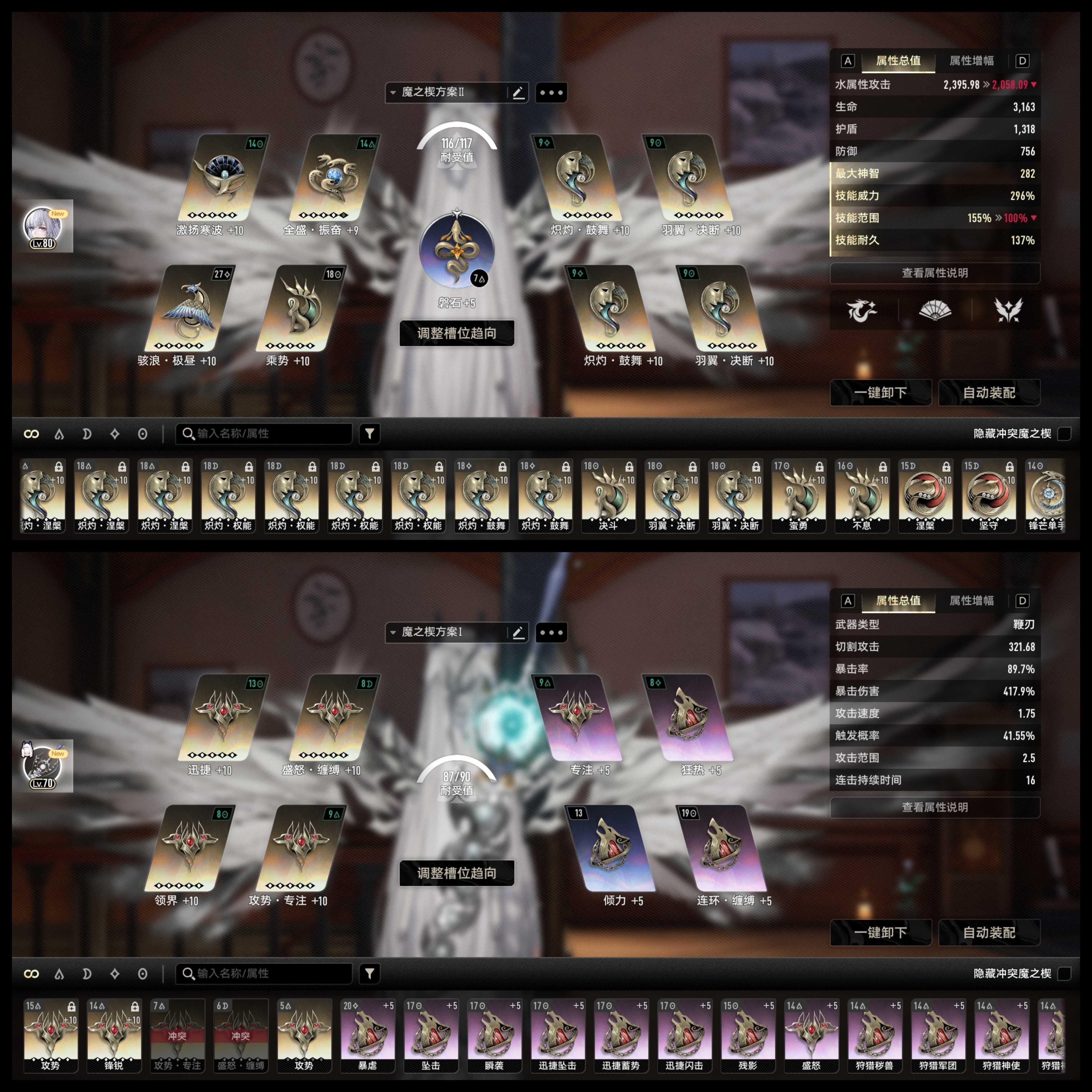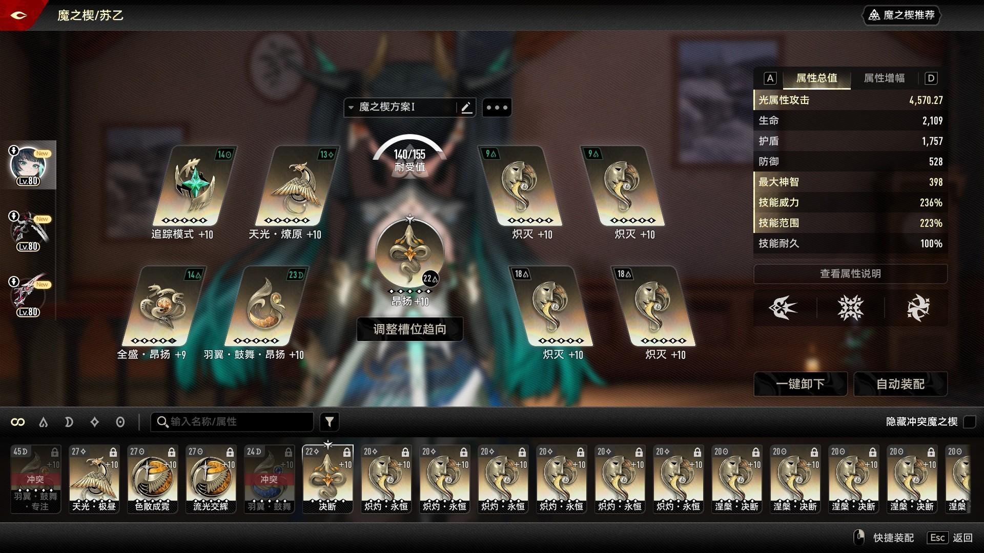由于天赋自带30的范围,再带一个燎原,总共有63的范围,完全可以吃到羽翼鼓舞昂扬的属性。