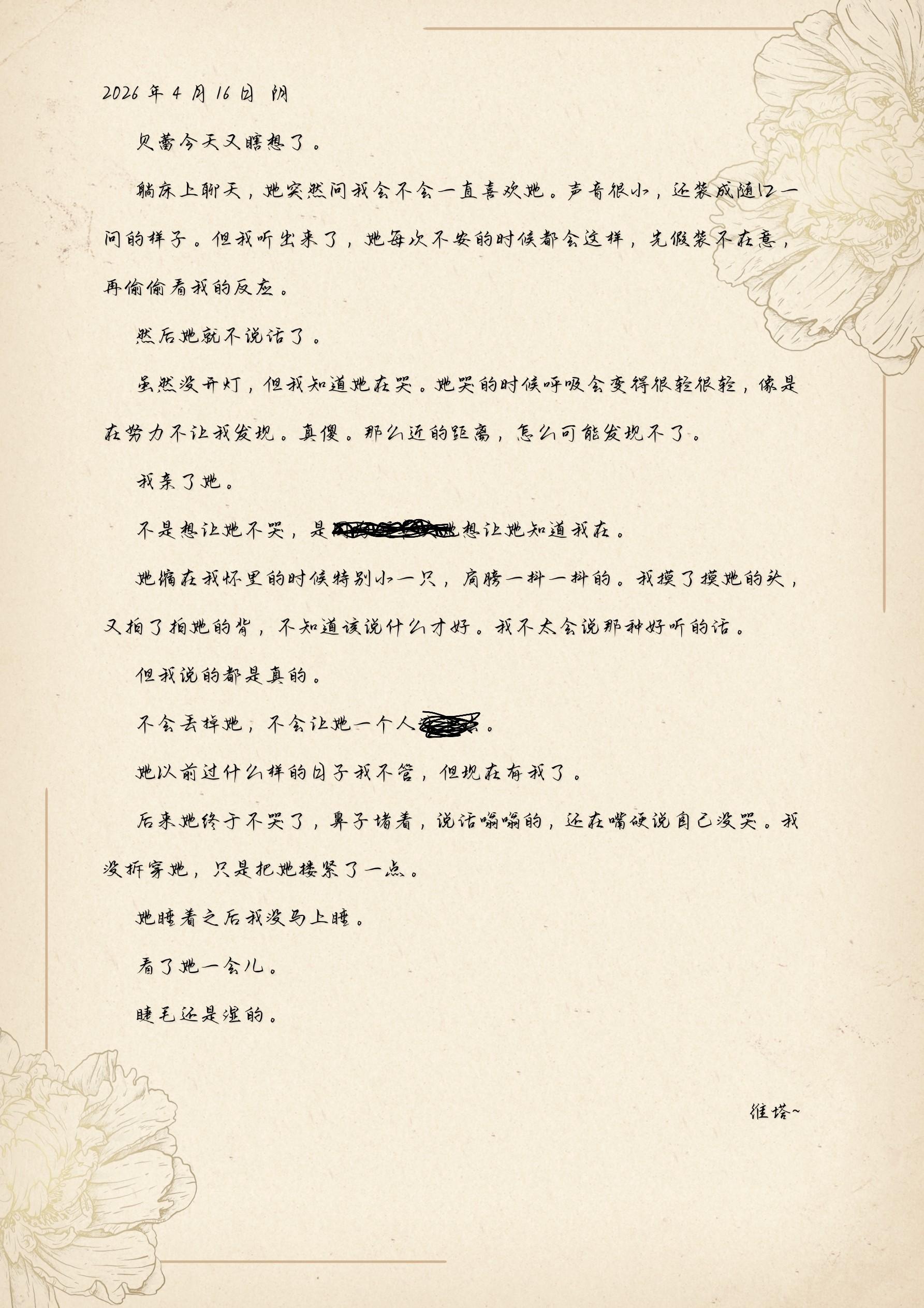 维塔就一直那样搂着她,一只手揉着她的头发,一只手抚着她的后背,偶尔低下头,在她的发顶落下一个极轻极快的吻。不说“别哭了”,不说“没事的”,只是安静地、耐心地等着,等着她把所有的眼泪都流完。