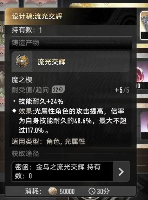 “流光交辉”是基于技能耐久提供攻击力加成,一般考虑搭配“天光极昼”使用,可以大幅延长“遨游”buff的时间。