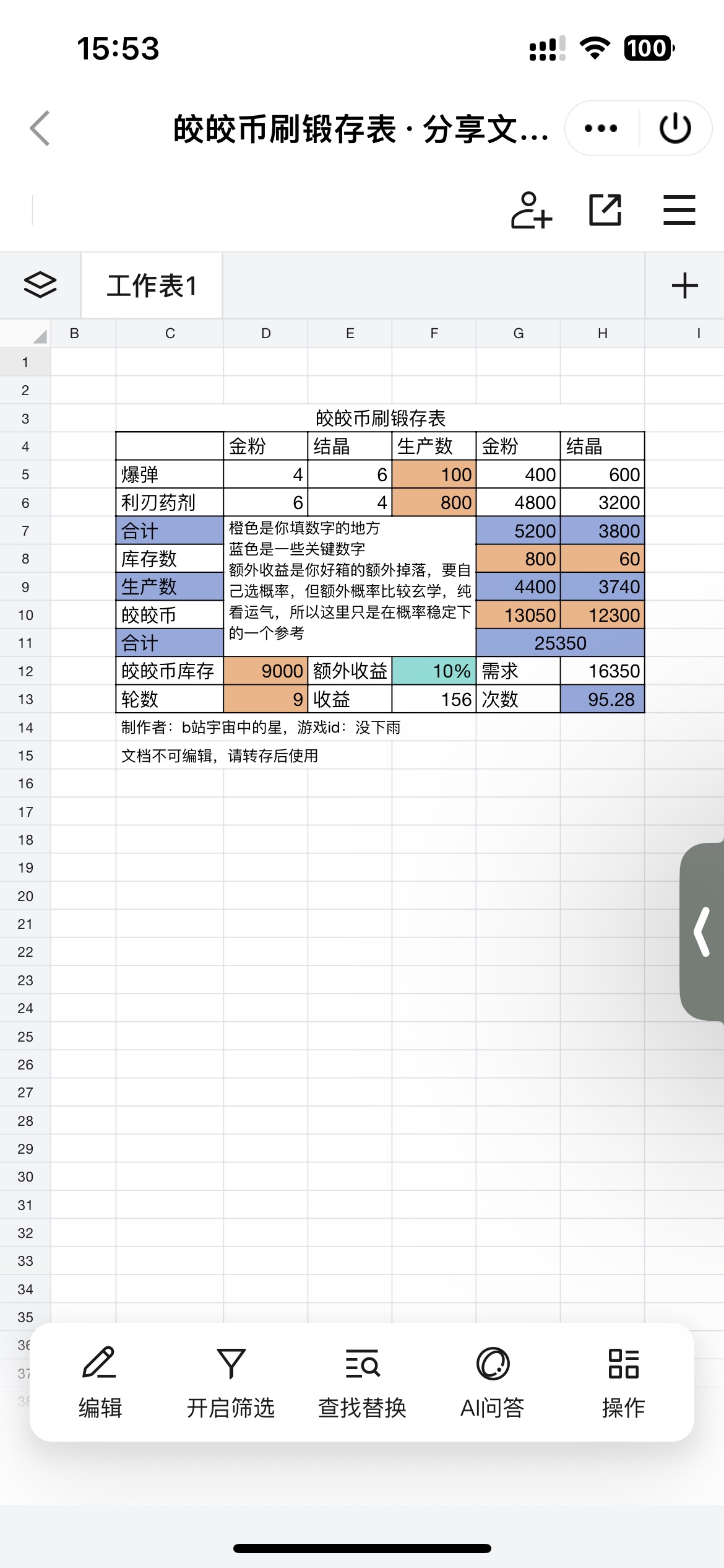 这是一份帮助无法99扼守的新手玩家管理皎皎币的进销存报表,食用指南可以去b站